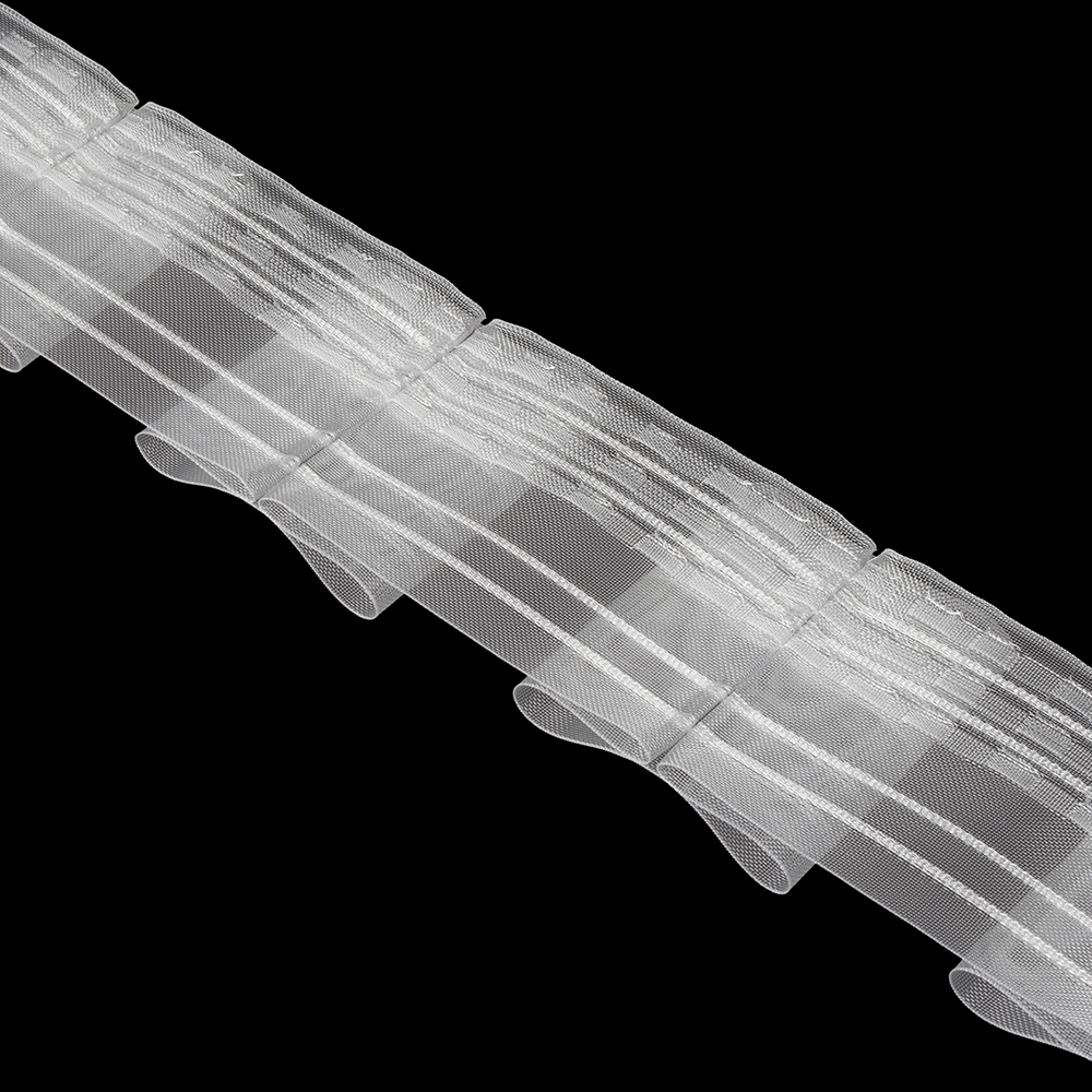 Die transparente Ausführung (MP) passt hervorragend zu feinen Voile- oder Batiststoffen. Das Band bleibt optisch dezent im Hintergrund, während die Faltenstruktur die Wirkung des Stoffes unterstützt. Zudem ist das Material langlebig, formstabil und pflegeleicht.
